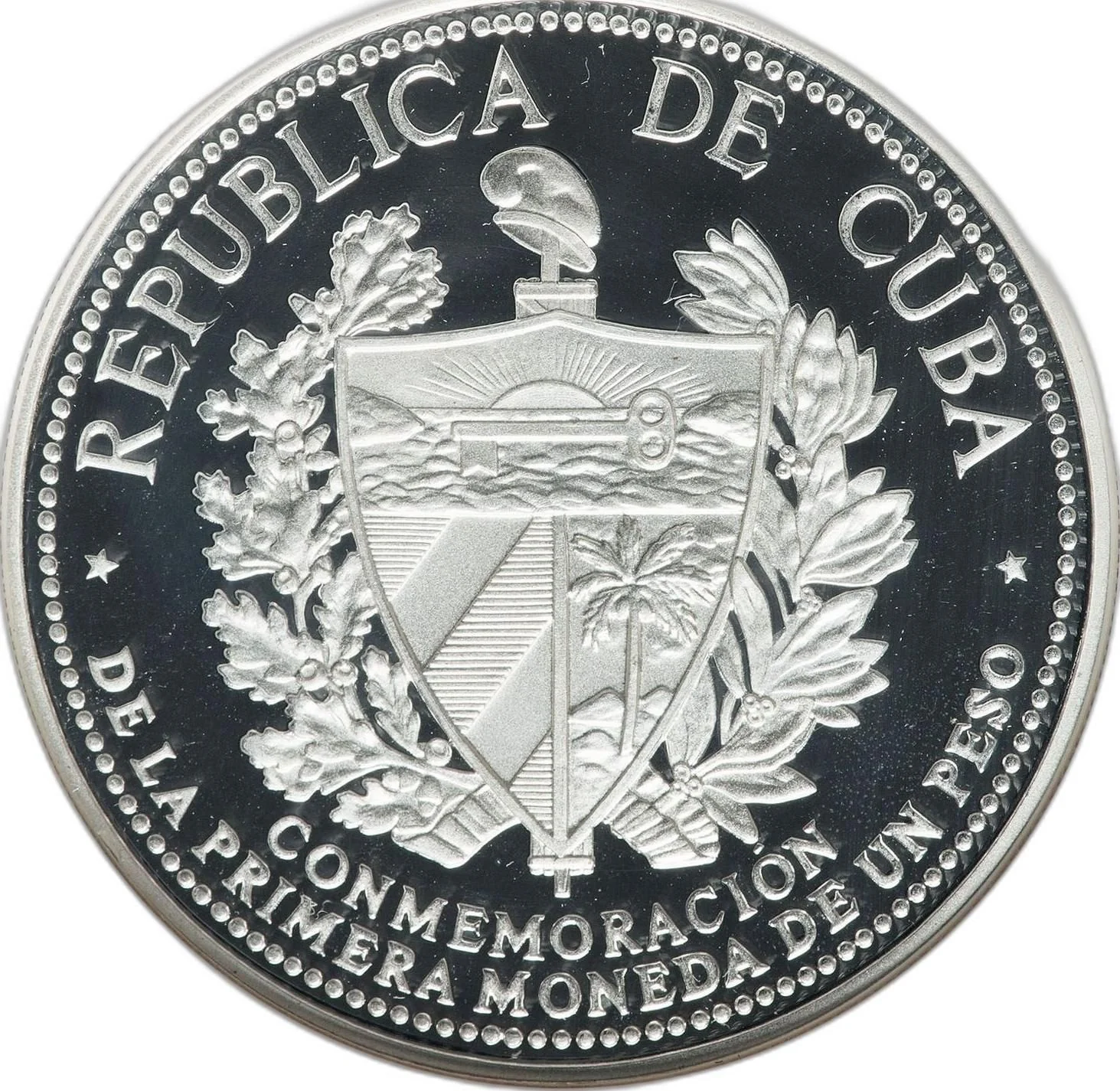 Cuban coat of arms with country name above, face value below, and weight/fineness on the sides.