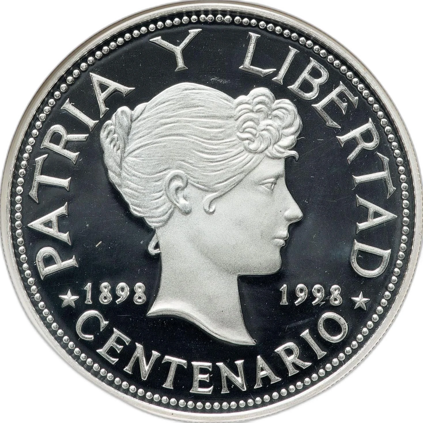 Based on an 1898 Peso coin, featuring Leonor Molina as the Republic with a motto above and dates flanking her neck.