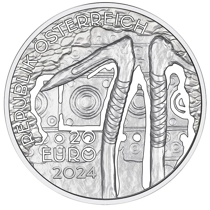 Bronze pickaxes from the Hallstatt salt mines, depicted with rocks and a period ornamental design.