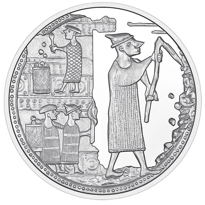 In collage style, the coin's reverse depicts salt being mined and transported.