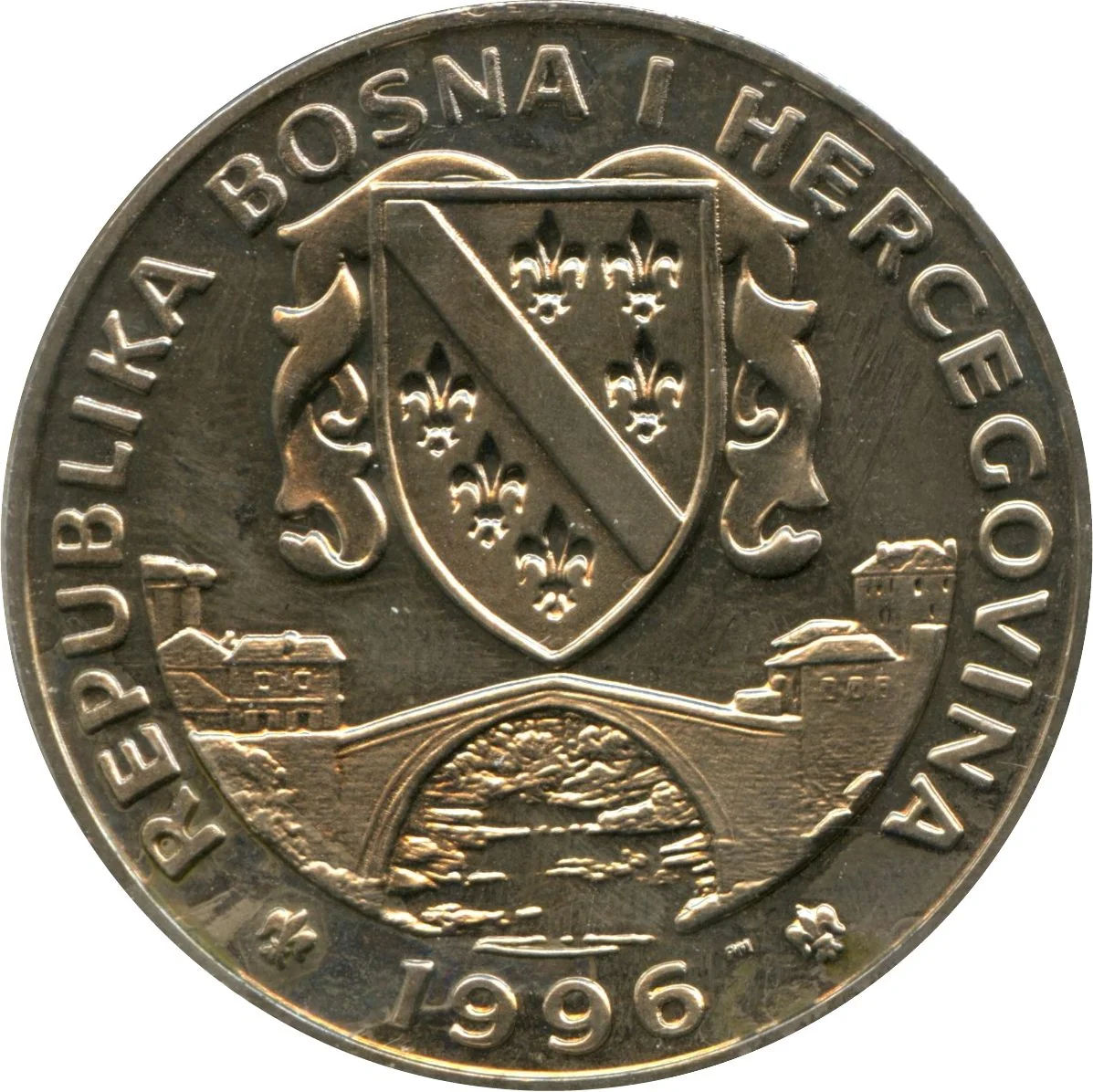 Bosnian emblem above Mostar Bridge; mintmark below bridge, right of date.