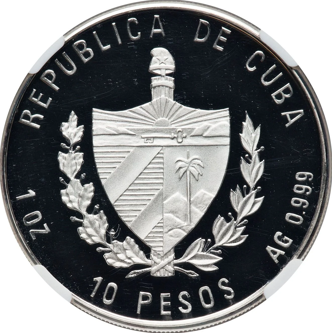 Cuban coat of arms with country name above, face value below, and weight/fineness on the sides.