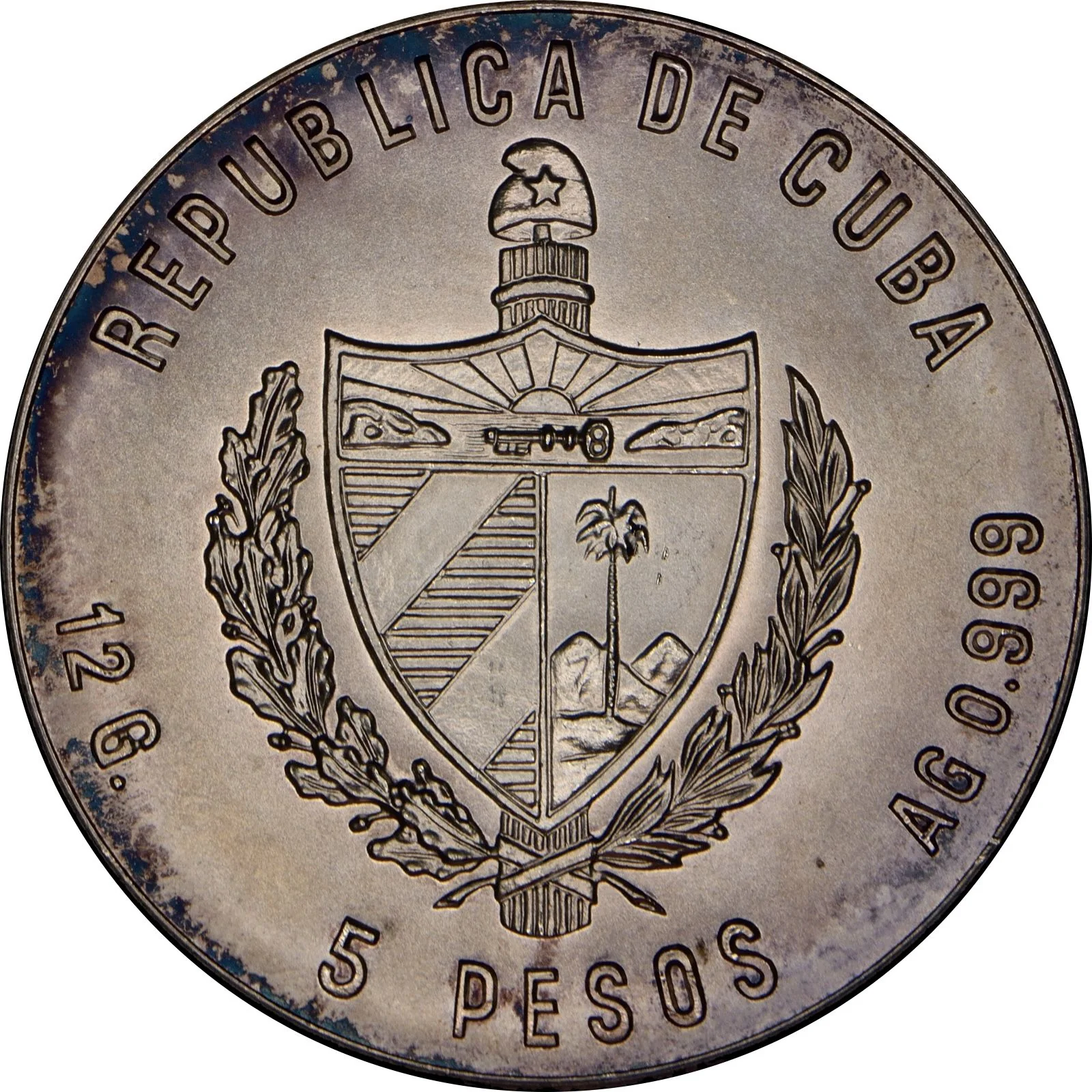 Cuban coat of arms with country name above, weight and fineness on the sides, and face value below.