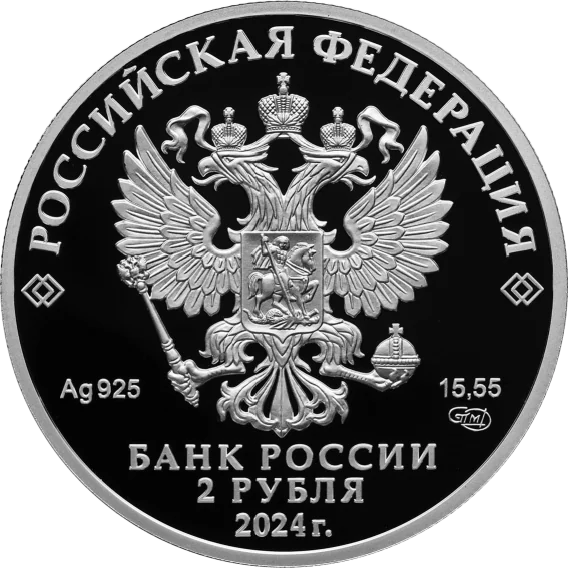 The obverse features the Russian Federation coat of arms with "РОССИЙСКАЯ ФЕДЕРАЦИЯ" above, flanked by diamonds. Below are the metal details and mint mark. The bottom center reads "БАНК РОССИИ", "2 РУБЛЯ", and "2024 г.".