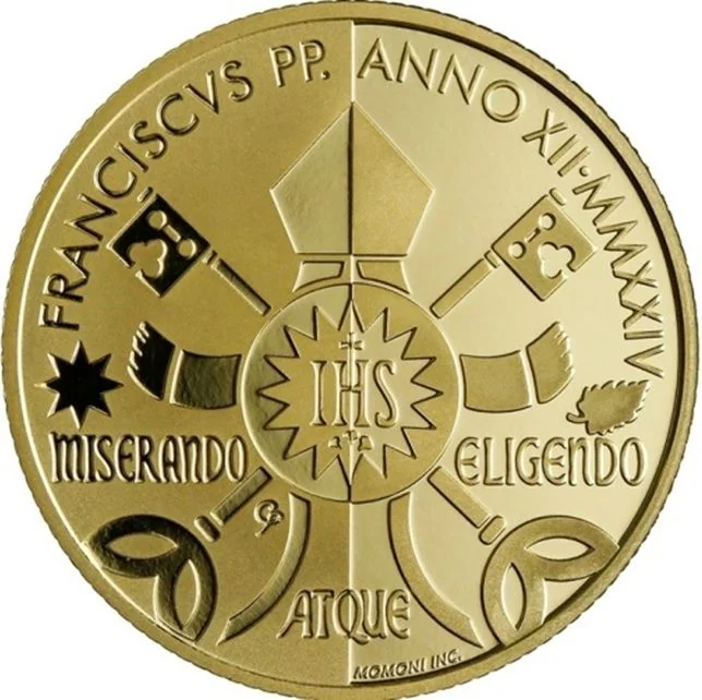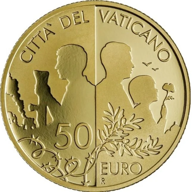 This 50 euro gold coin uses satin and polished gold planes. Its reverse depicts war and peace linked by barbed wire transforming into an olive branch. On the war side, a soldier stands before smoke and rubble. On the peace side, a father and child watch birds fly, a flower in her hand.