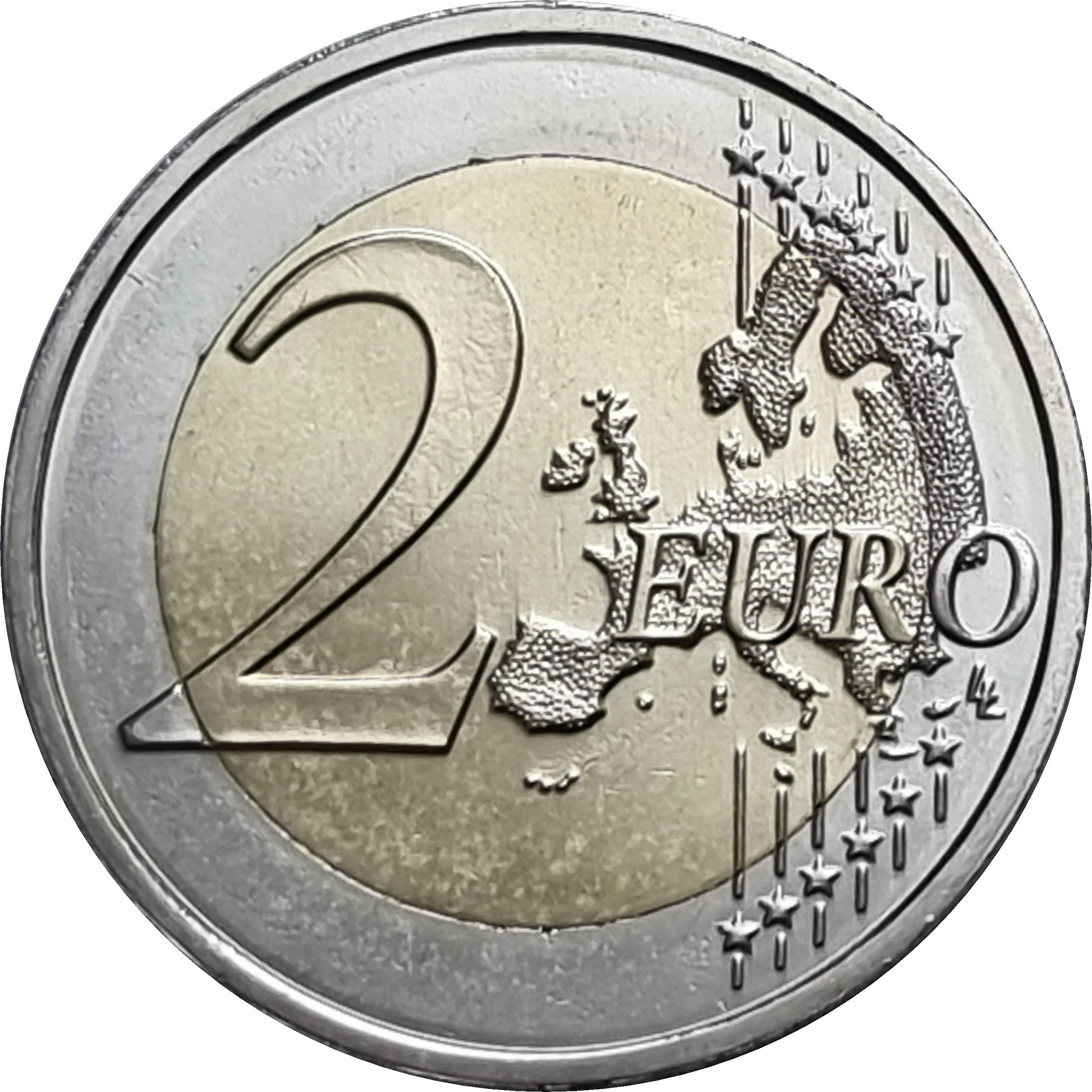 A Western Europe map spans the coin's right side, with "2 EURO" overlaid—the "2" in the Atlantic. Twelve stars flank the map, six above and six below, connected by six vertical stripes across the inner core.