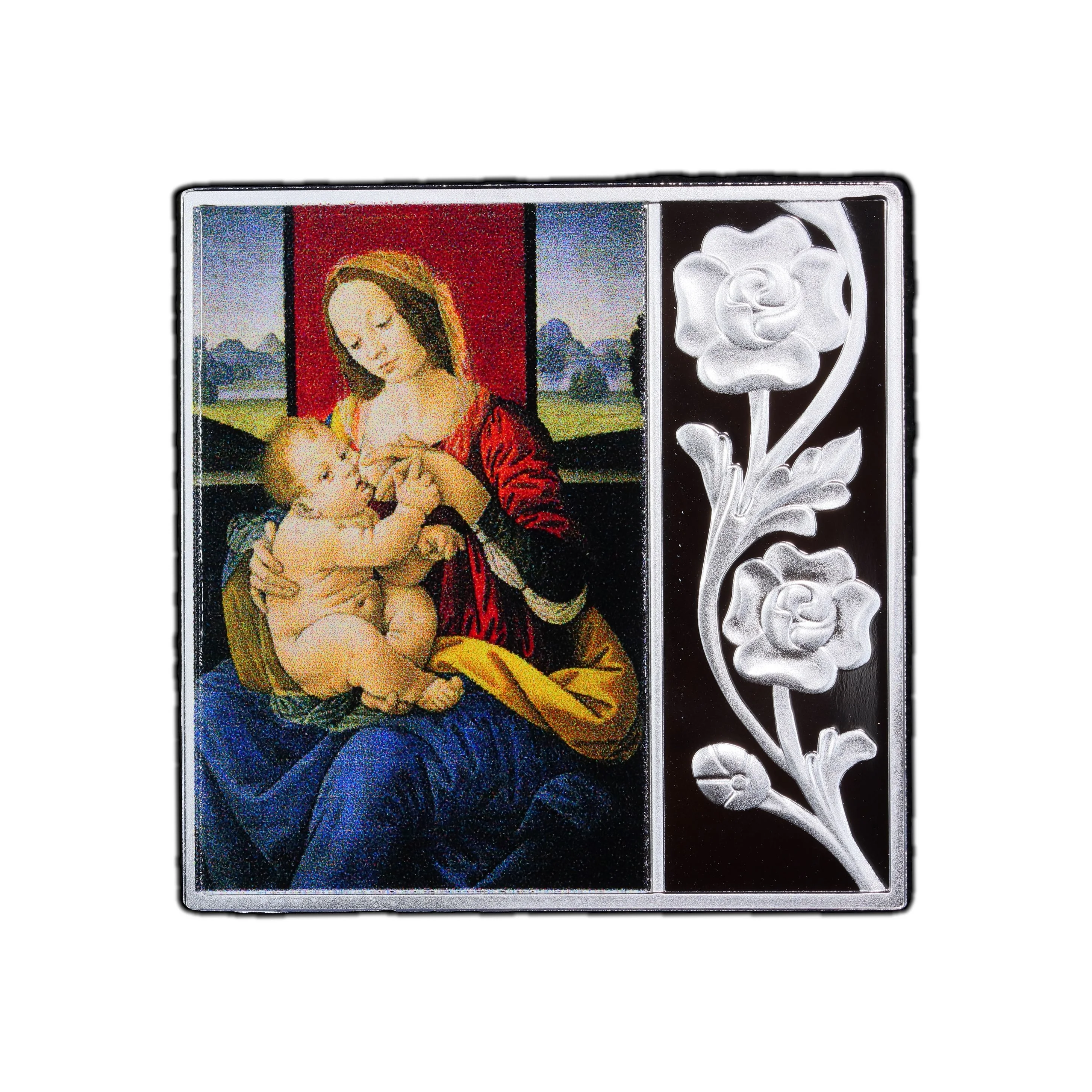 Lorenzo di Credi's "Madonna and Child" (c. 1480-85), detail with roses at right.