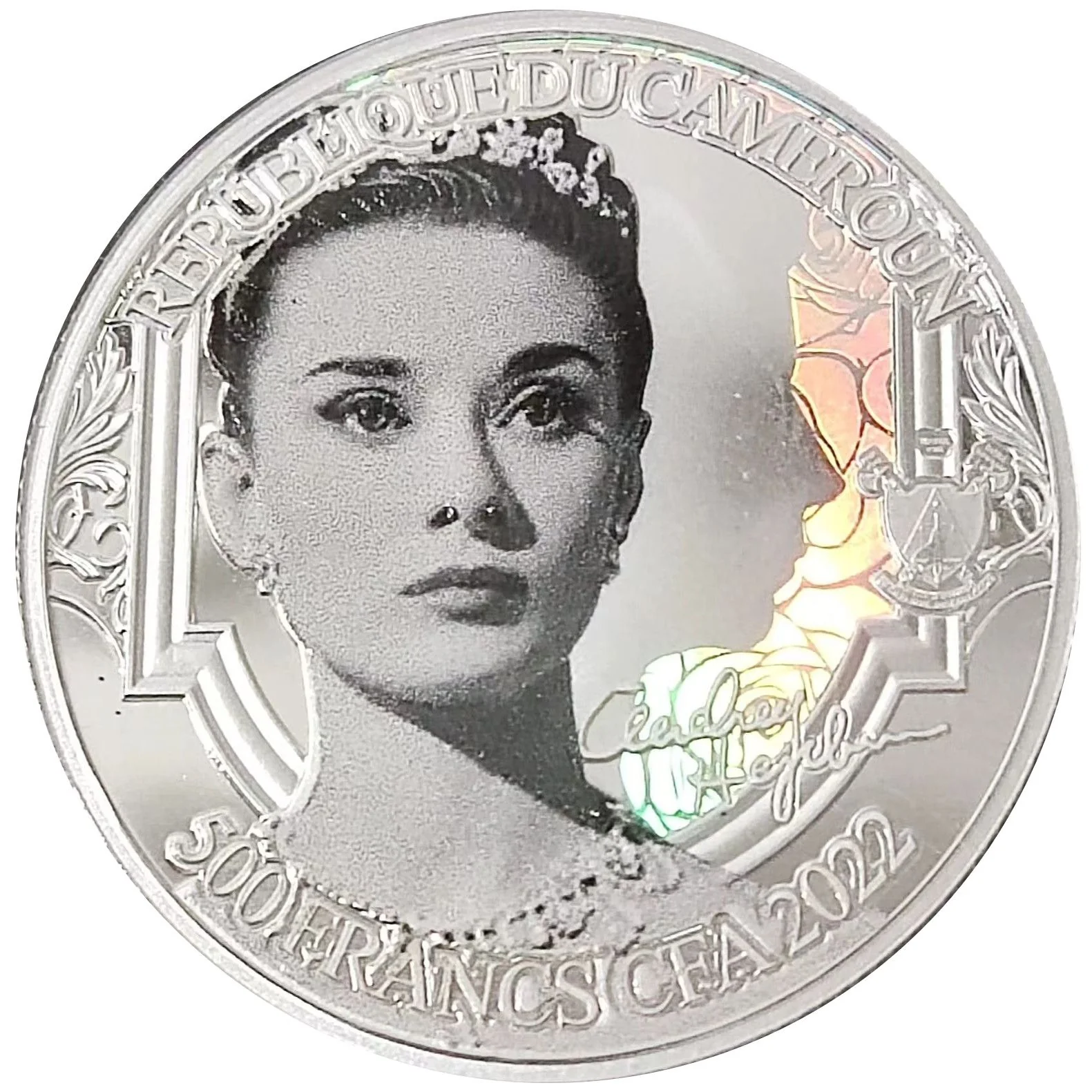 Audrey Hepburn bust, Cameroon coat of arms, and her signature below.