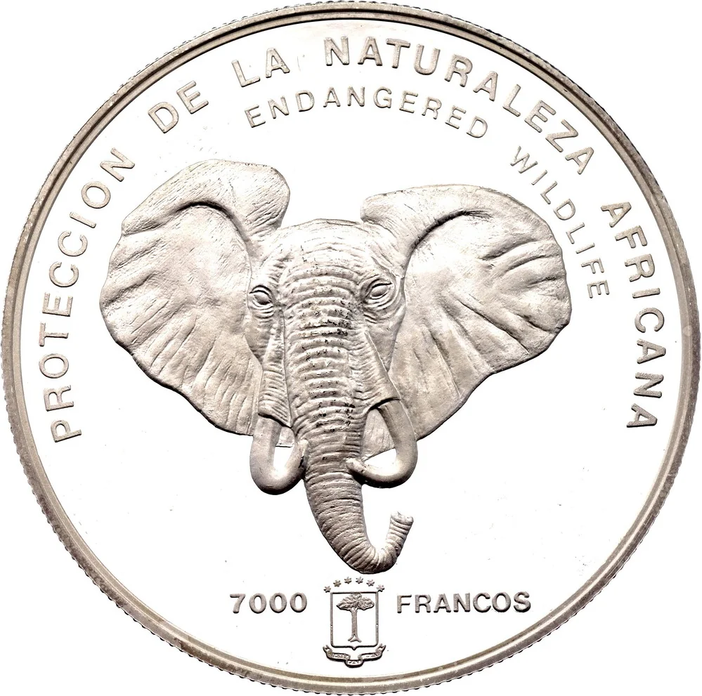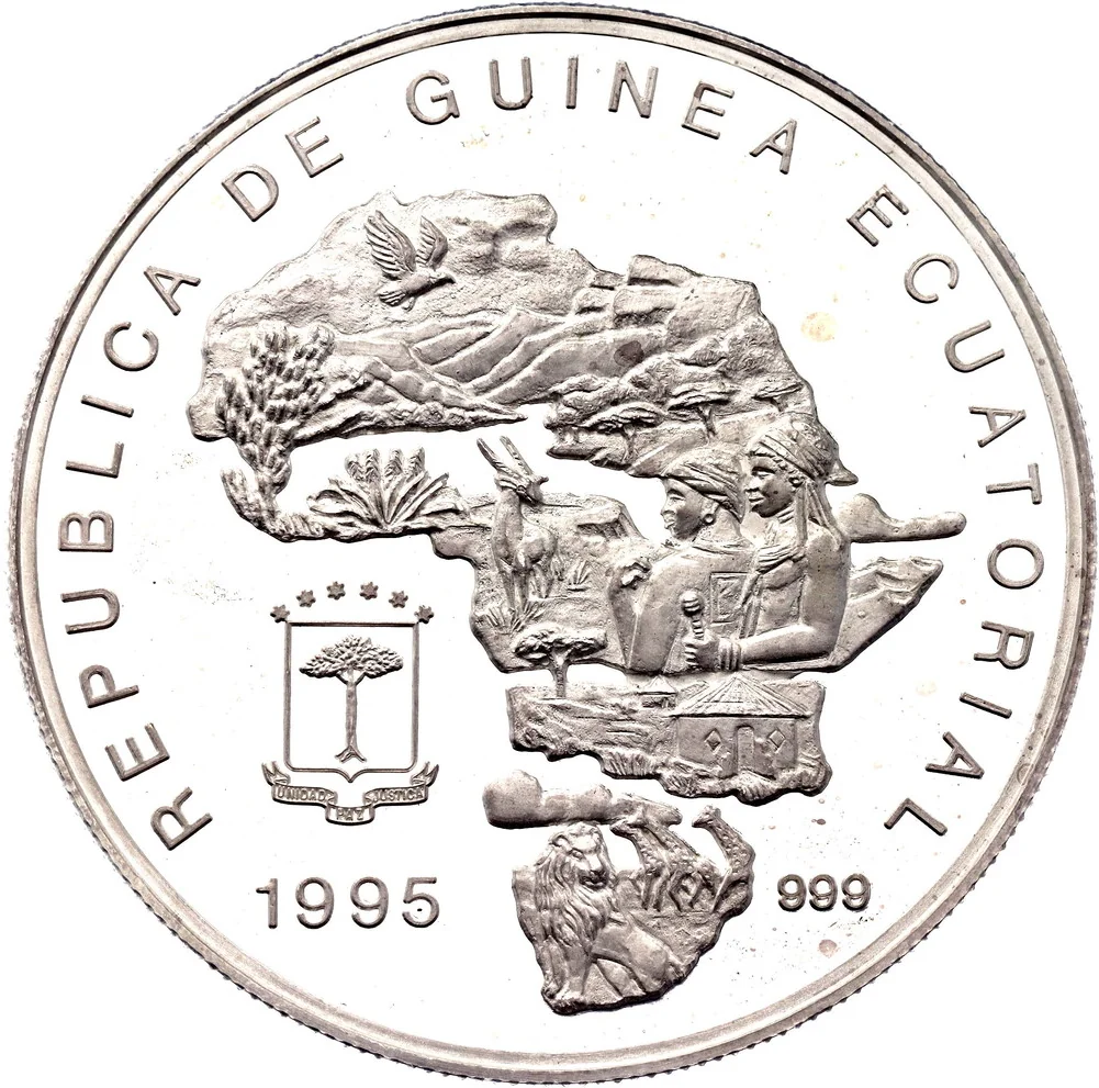 Equatorial Guinea's coat of arms at lower left. African map formed by landscapes, traditions, and wildlife.
