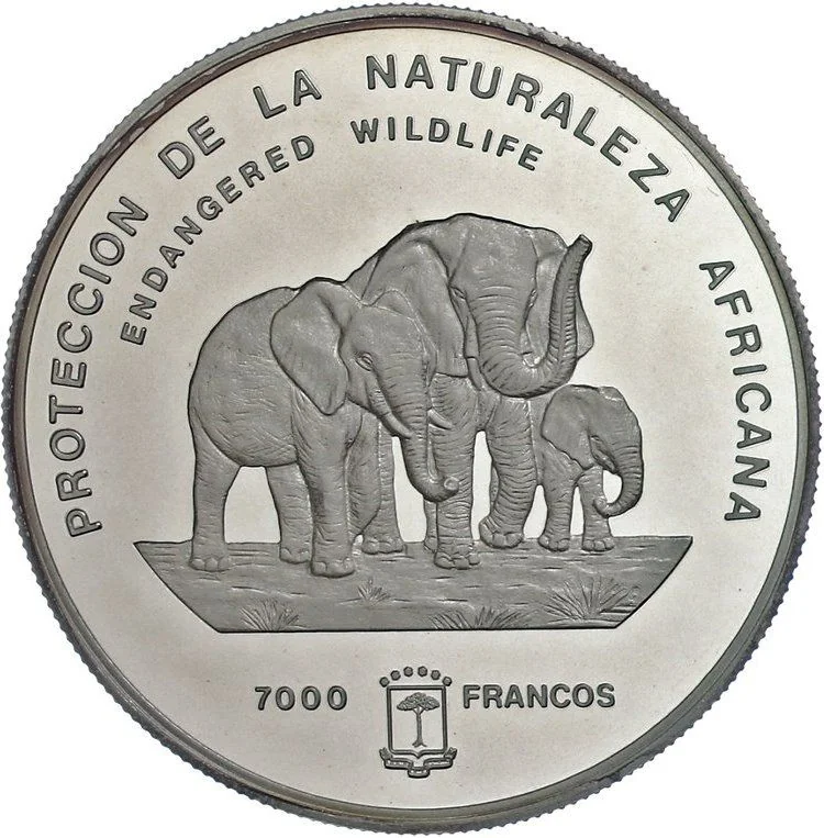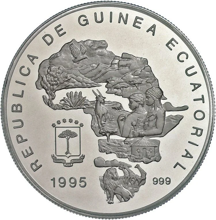 Equatorial Guinea's coat of arms at lower left. African map formed by landscapes, traditions, and wildlife.