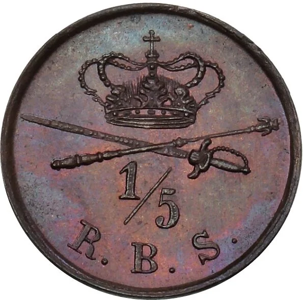 Crowned Danish sword and scepter; below, 1/5 R.B.S.