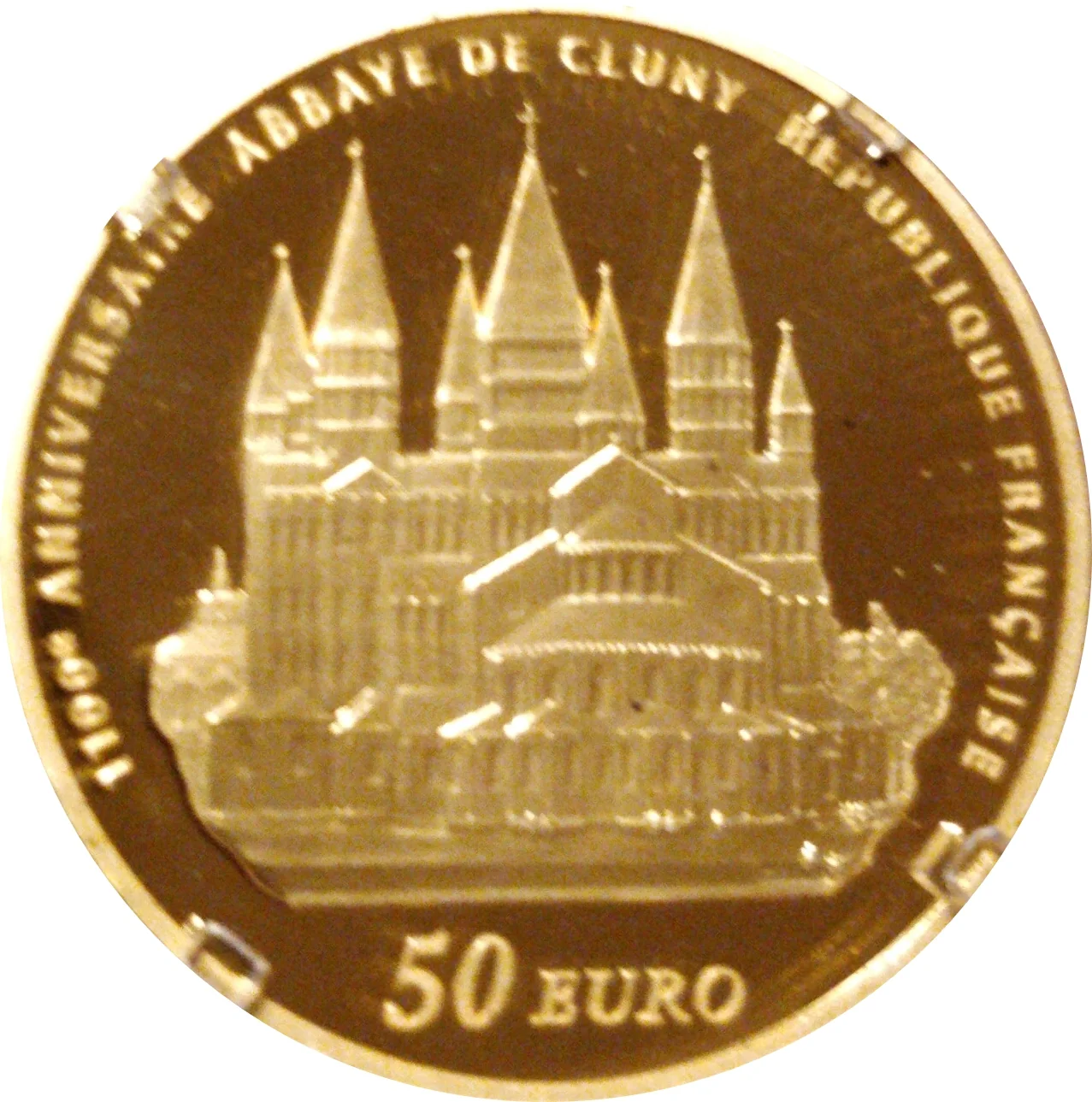 Cluny Abbey depiction. Above: "1100e ANNIVERSAIRE ABBAYE DE CLUNY RÉPUBLIQUE FRANÇAISE". Below: "50 EURO".