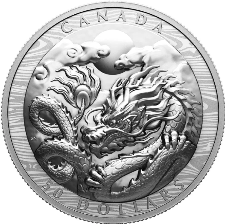 Simon Ng's reverse design marks 2024 as the Year of the Wood Dragon. Framed by a laser-engraved Wood element pattern, the Dragon moves through a moonlit night sky, its tail coiled to form the lucky number 8.