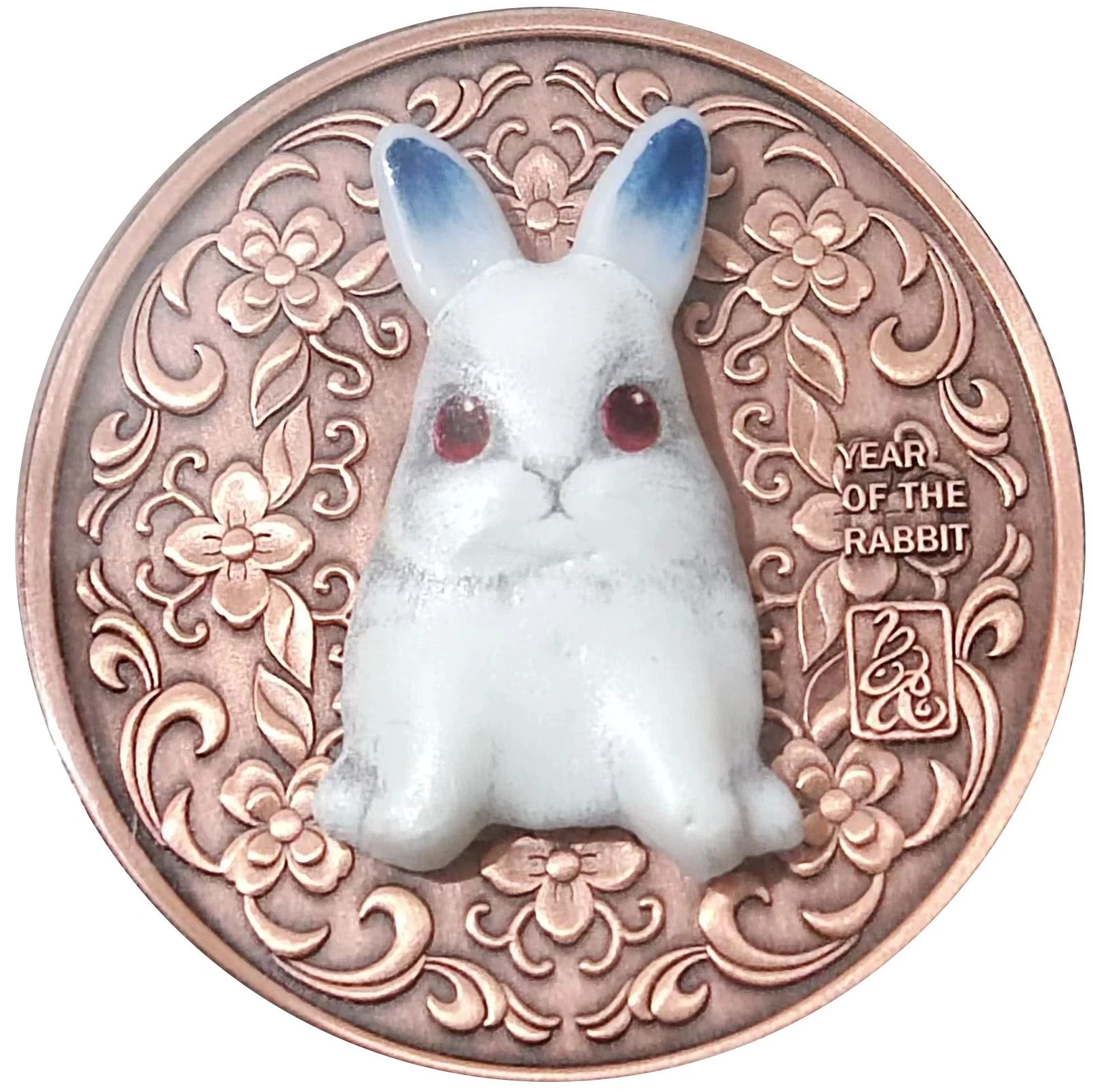 Porcelain with engraved pattern and colored relief of a cute rabbit. Features "YEAR OF THE RABBIT" on the right and a stylized Chinese "兔" below.