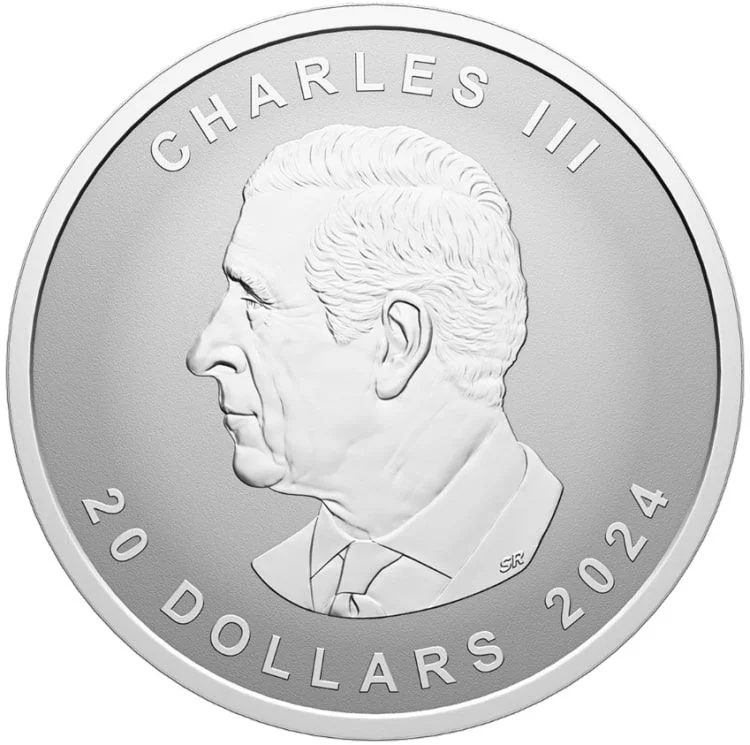 Your coin's reverse features an ultra-high relief Silver Maple Leaf. The raised maple leaf is set against a "heart of the forest" pattern; tilting the coin creates a light play that gives the illusion of a misty, endless forest.