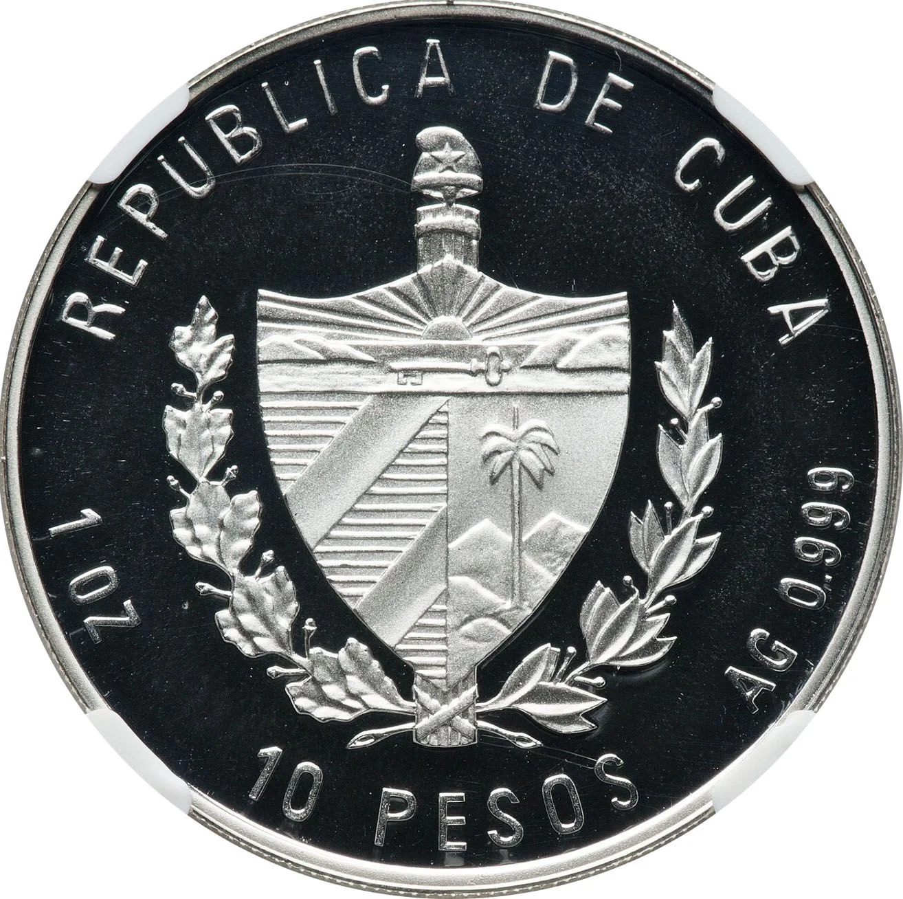 Cuban coat of arms with country name above, face value below, and fineness and weight on the sides.