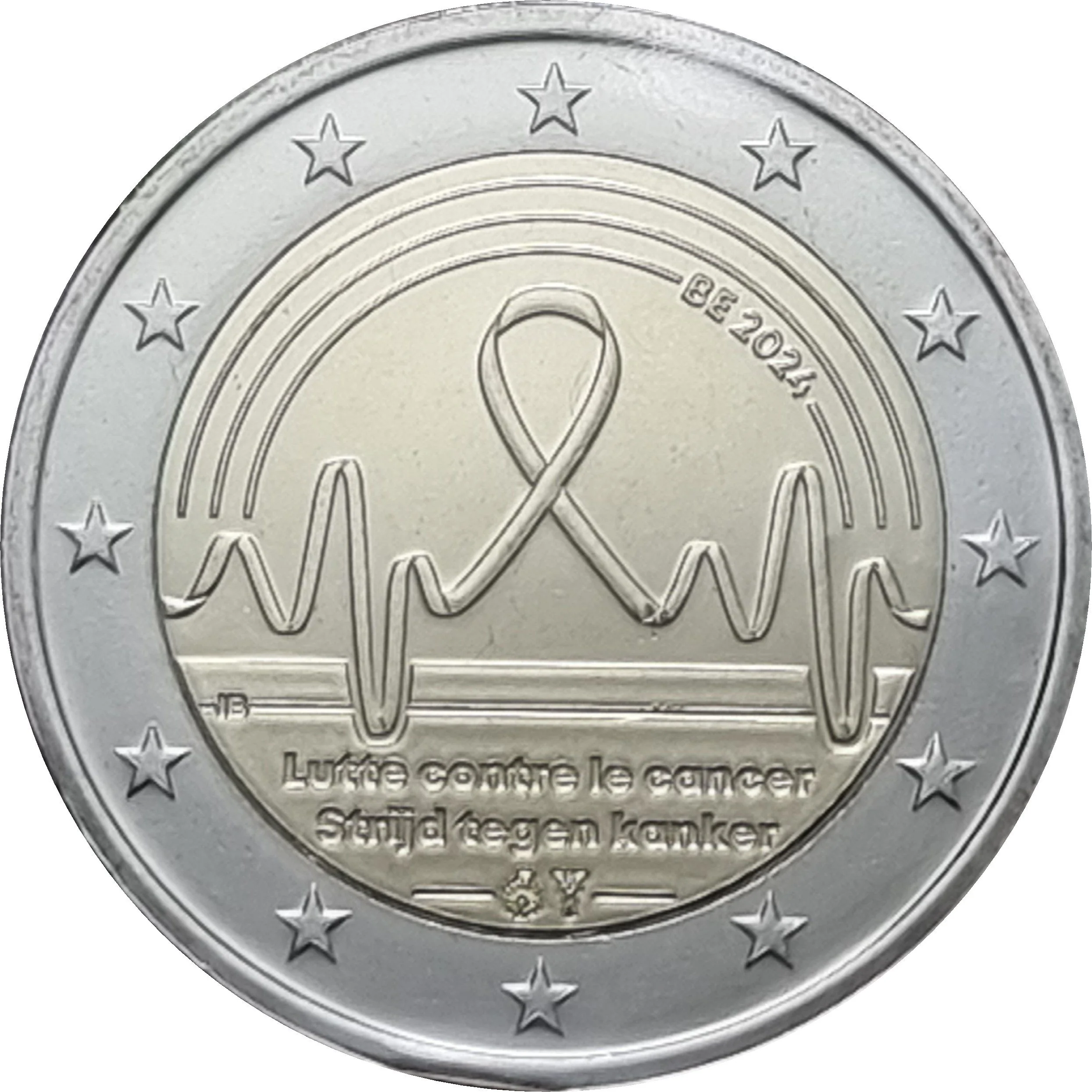 Description: The obverse depicts a stylised rainbow, symbolising hope for a cancer-free world, alongside the country and year BE 2024. A heartbeat forms the central awareness ribbon. The bilingual text "Lutte contre le cancer - Fight against cancer" appears at the bottom, with the designer's initials (IB), the mintmaster's mark (Erlenmeyer flask with aster), and the Royal Dutch Mint mark (Mercury staff).