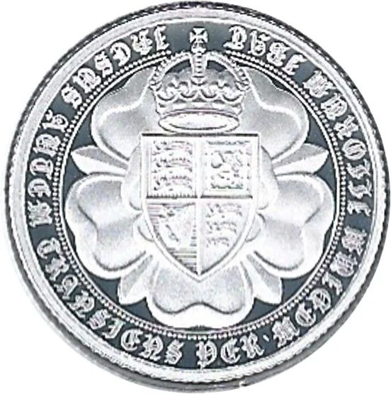 King Charles III's crowned shield atop a Tudor Rose, encircled by a legend.