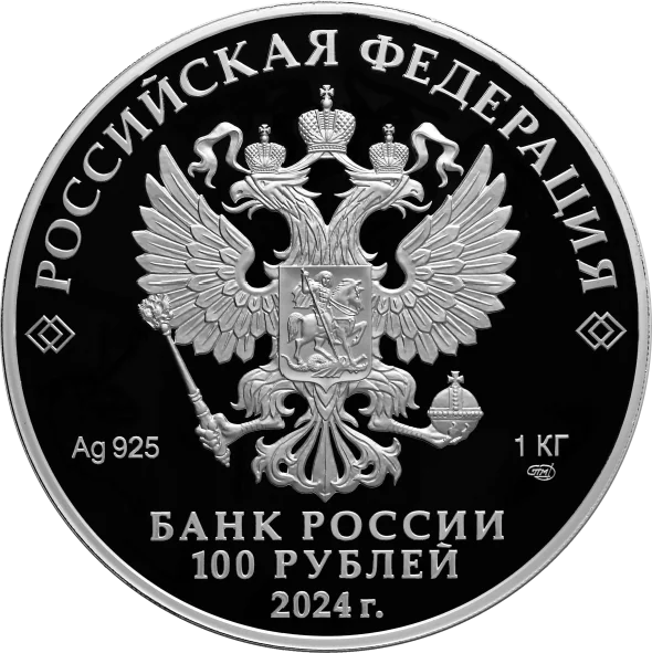 The obverse features the State Coat of Arms of the Russian Federation, inscriptions for "RUSSIAN FEDERATION," "BANK OF RUSSIA," "100 ROUBLES," "2024," metal specifications, mint mark, and fine metal content.