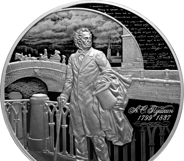 The disc's mirror field features a laser-treated matte relief of Alexander Pushkin before the Hermitage Theatre and Bridge, with scenes of the Winter Canal, Peter and Paul Fortress, the city, and a cloudy sky. An arch displays lines from the "Monument" manuscript. The right side bears the relief inscription "А.С. Пушкин," his dates "1799" and "1837," and a decorative ornament.