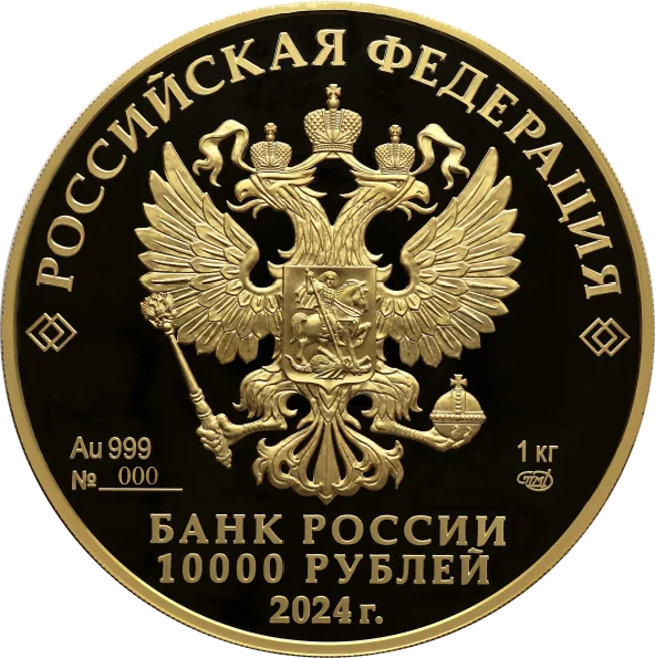 The disc's mirror field features the relief image of the National Coat of Arms of the Russian Federation. Above it, a semicircular inscription reads "РОССИЙСКАЯ ФЕДЕРАЦИЯ," flanked by doubled rhombuses. Below the coat of arms are markings for the metal and fineness on the left, and the fine metal content and mint mark on the right. Centered at the bottom is a three-line inscription: "БАНК РОССИИ," the coin's denomination.