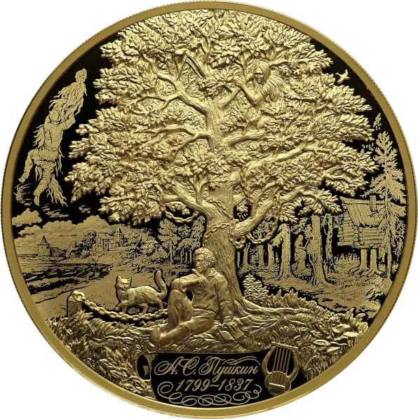 The disc's mirror field features a matte laser-finished relief of Alexander Pushkin seated under an oak, backed by scenes from his fairy tales. Below this are a matte laser-finished scroll inscribed "А.С. Пушкин" and "1799–1837" with an ornament, and a relief image of a lyre.