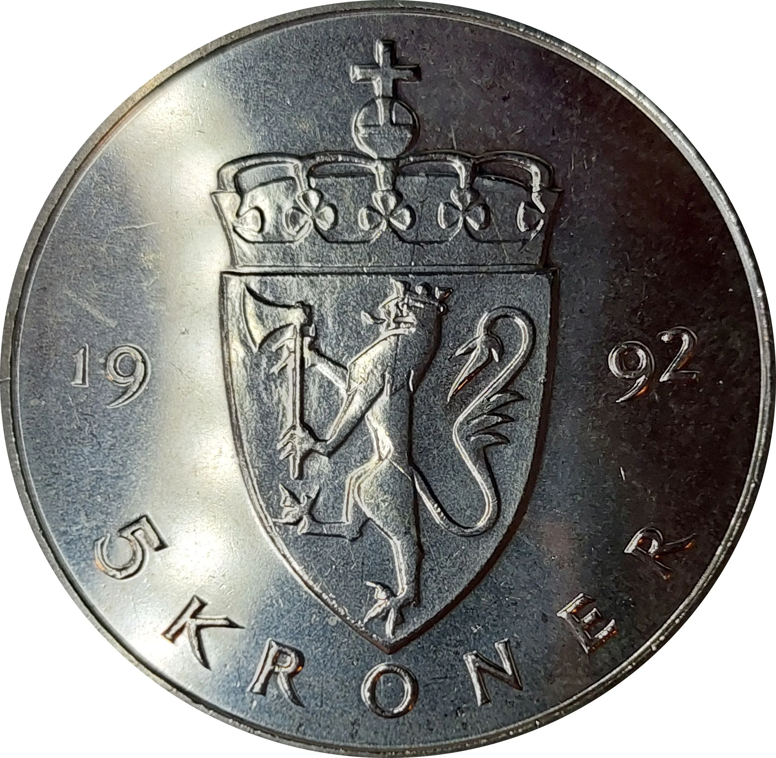 Crowned shield with a left-facing Norwegian lion holding a halberd. Date flanking the shield, value below. Solid rim ring.