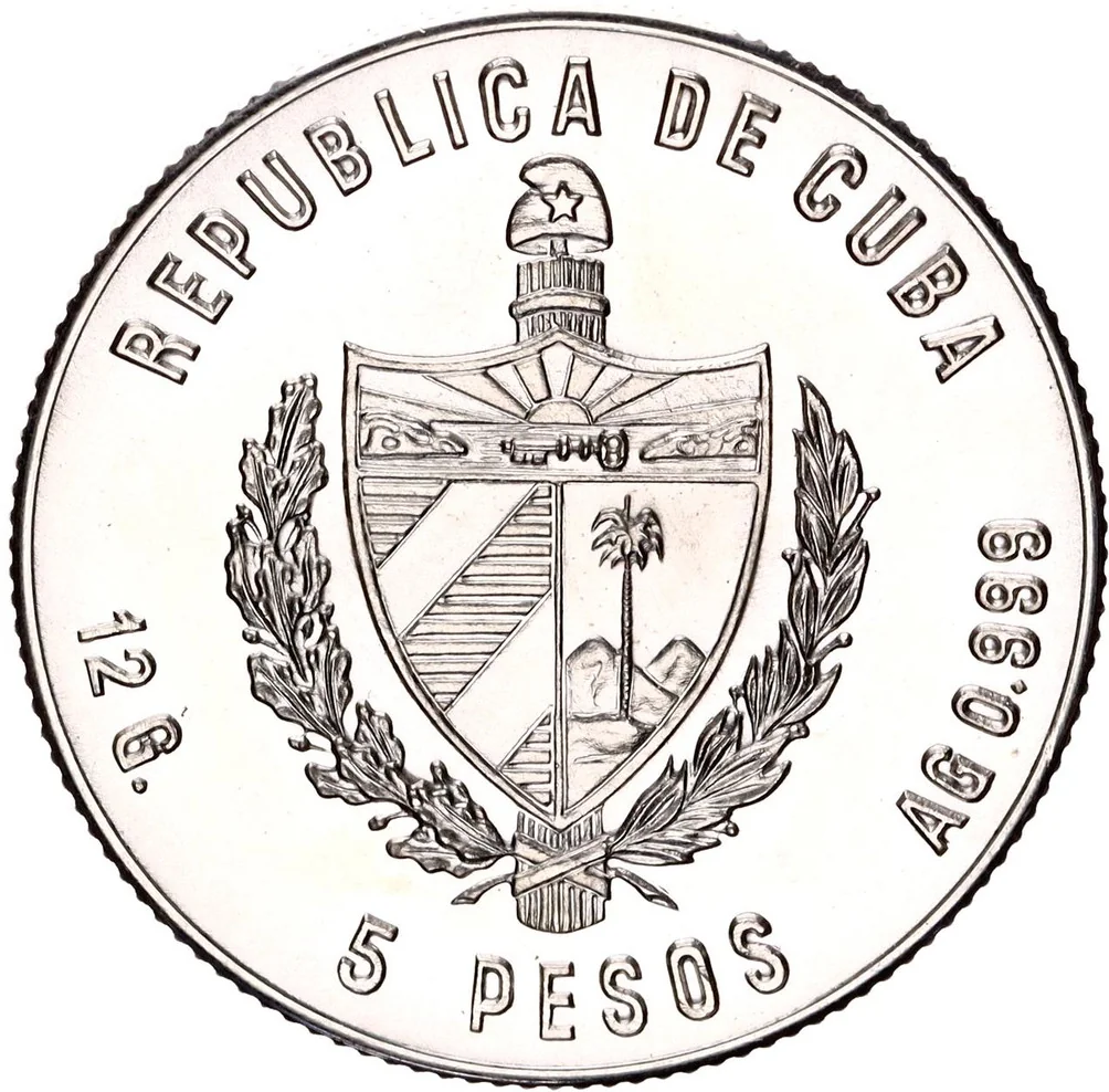 Cuban coat of arms with country name above, weight and fineness on the sides, and face value below.