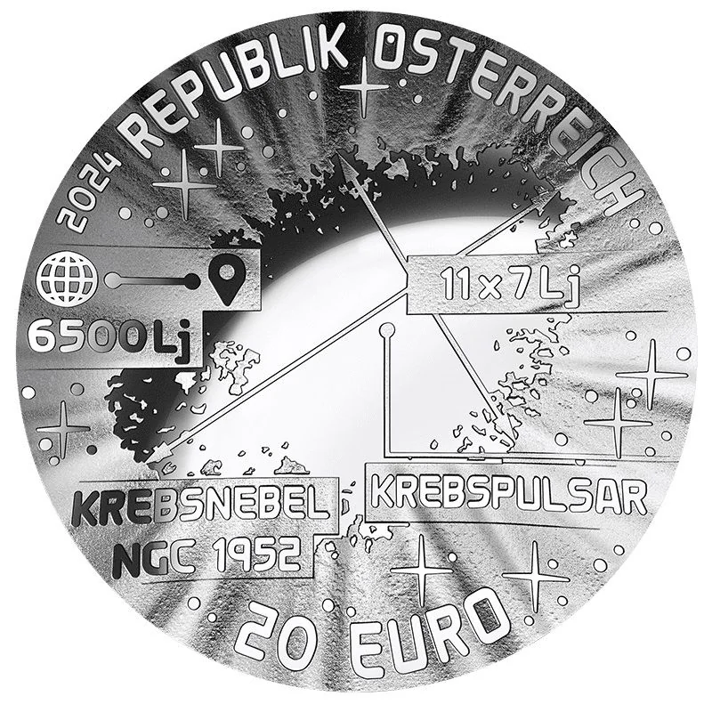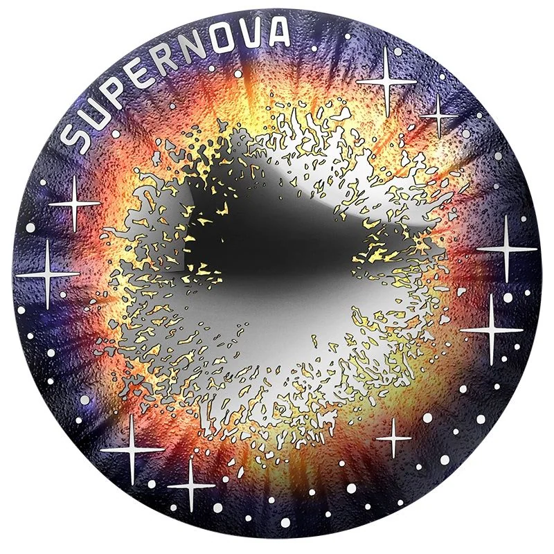 Supernova features a concave obverse depicting the Crab Nebula (NGC 1952), a 6,500 light-year distant remnant measuring 11x7 light years. The design also highlights the central, rapidly rotating Crab Pulsar.