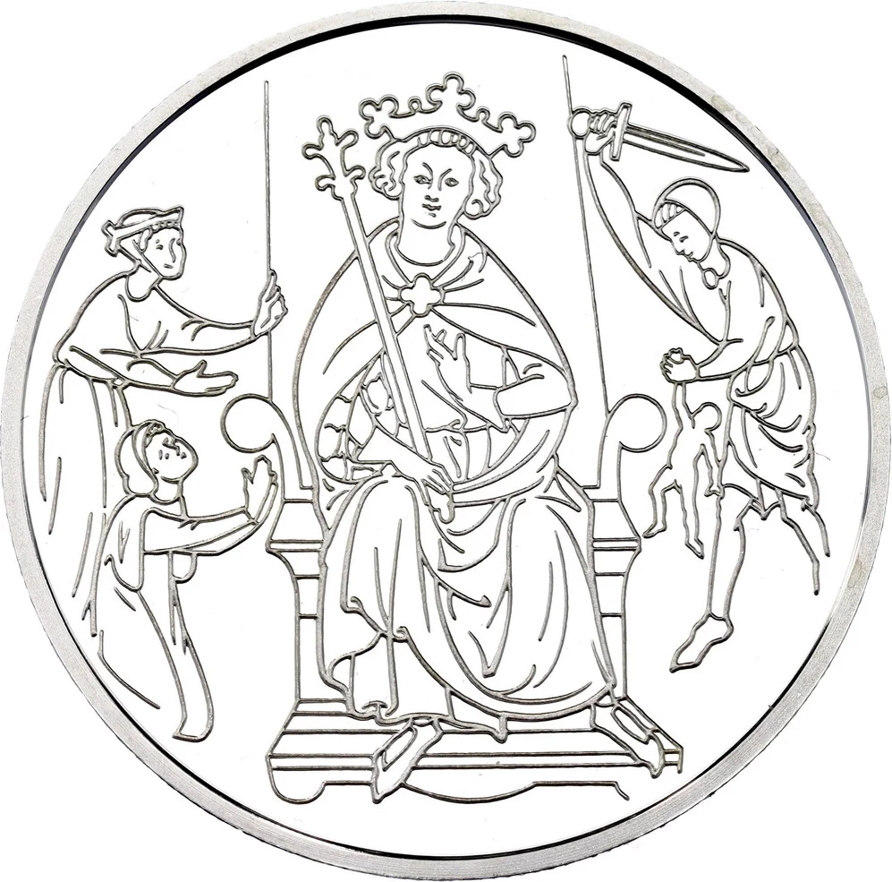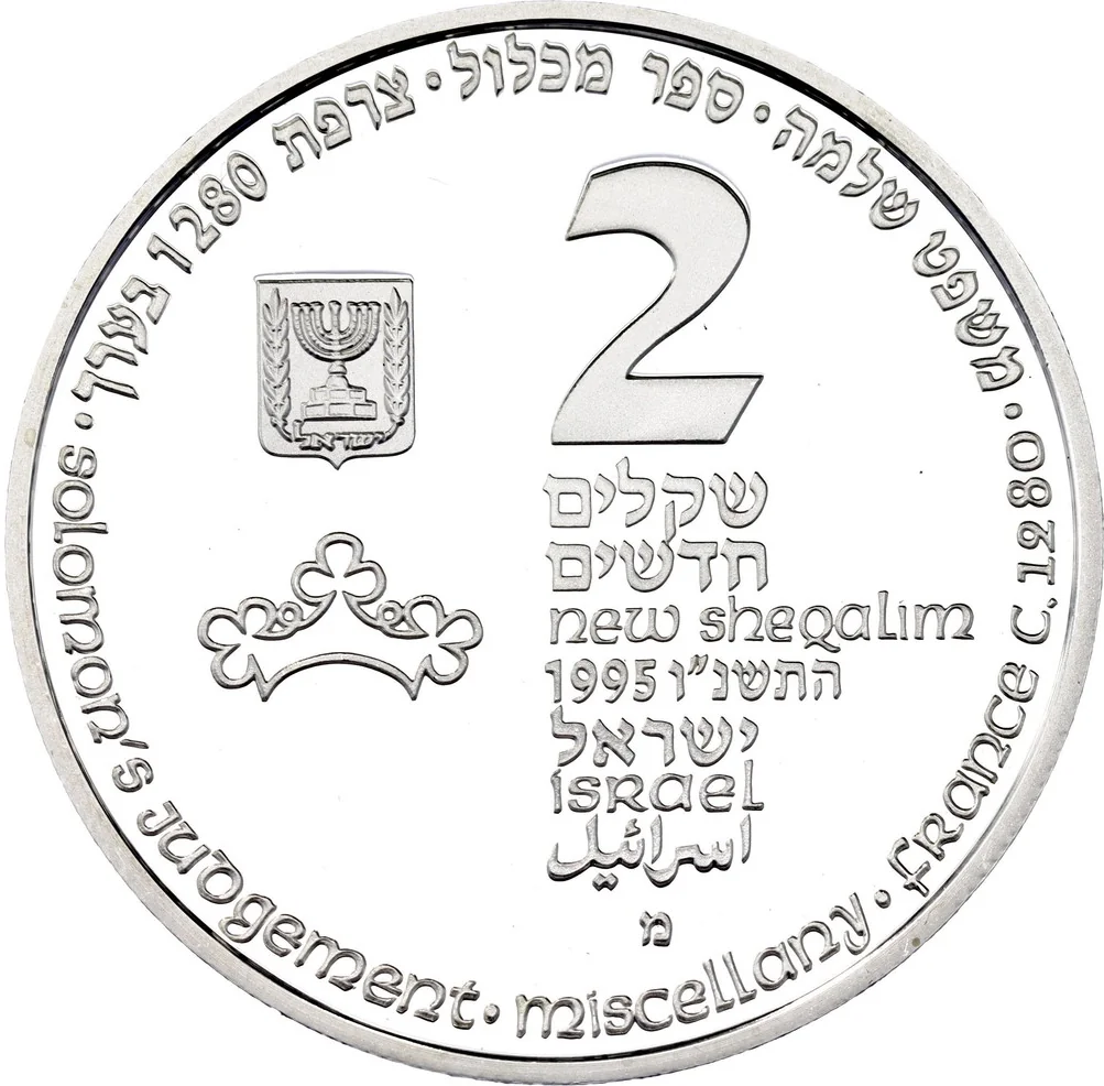 Face value "2 New Sheqalim" in Hebrew and English. Below: mint year 1995/5756 and "ISRAEL" in Hebrew, Arabic, and English. Left: State emblem over a decorative crown. Border inscription: "Solomon's judgement•miscellany•France c.1280" in English and Hebrew.