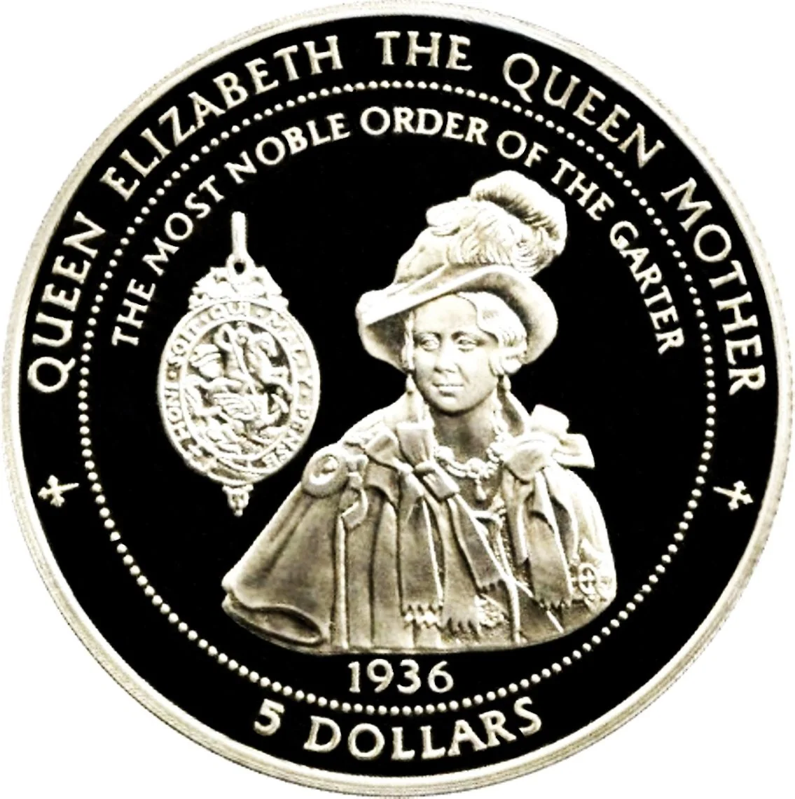 Queen Mother right, Garter left, date within beaded circle, denomination below.
