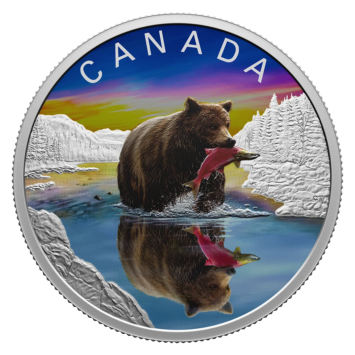 This coin's reverse depicts a grizzly bear catching a salmon in a mountain river at sunrise. Selective colour highlights the bear, fish, and their reflection, while textured finishes mimic fur and shimmering water.