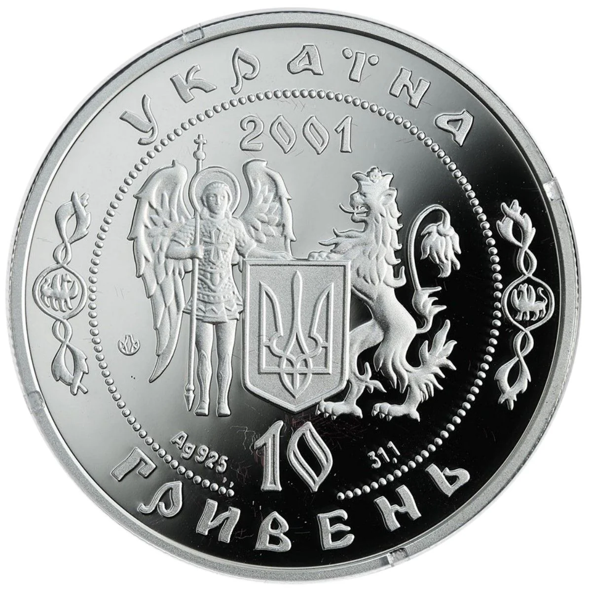 This coin features Ukraine’s national emblem alongside the symbols of Kyiv and Lviv: the Archangel Michael and a crowned lion. The inscriptions “UKRAINE,” “10 HRYVEN,” “2001,” Ag 925, and 31.1 g are separated by baroque ornamentation.