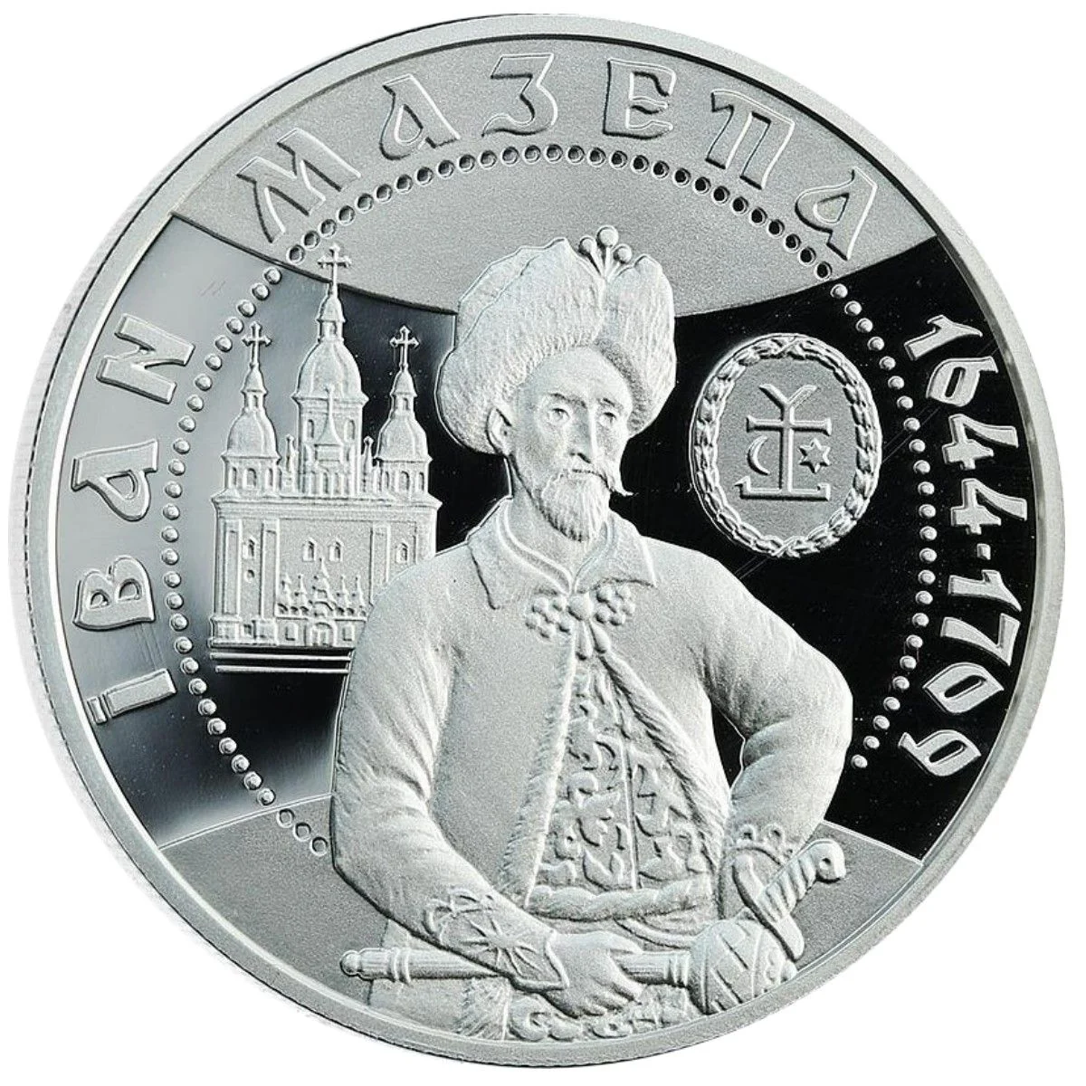 A beaded circle frames a portrait of Hetman Ivan Mazepa with his bulava, flanked by his coat of arms and a cathedral, encircled by his name.