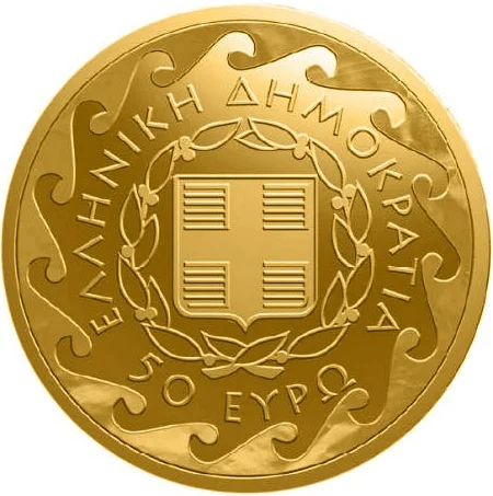 The obverse depicts the Hellenic Republic's coat of arms, encircled by a wave motif from a Hellenistic-era stone tabletop found at the Poseidon shrine in Pella.