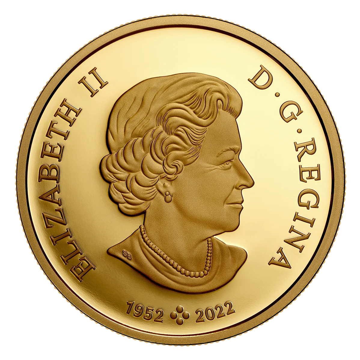 Queen Elizabeth II at 77, facing right, wearing a necklace and earrings. The effigy includes the dates "1952" and "2022," separated by four pearls representing her four coin portraits.