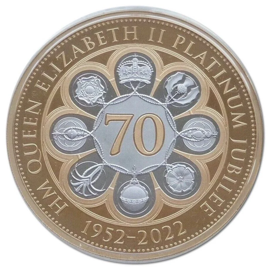 Design with 70 central, surrounded by Crown, Orb, and four national emblems. Outer circle contains lettering.