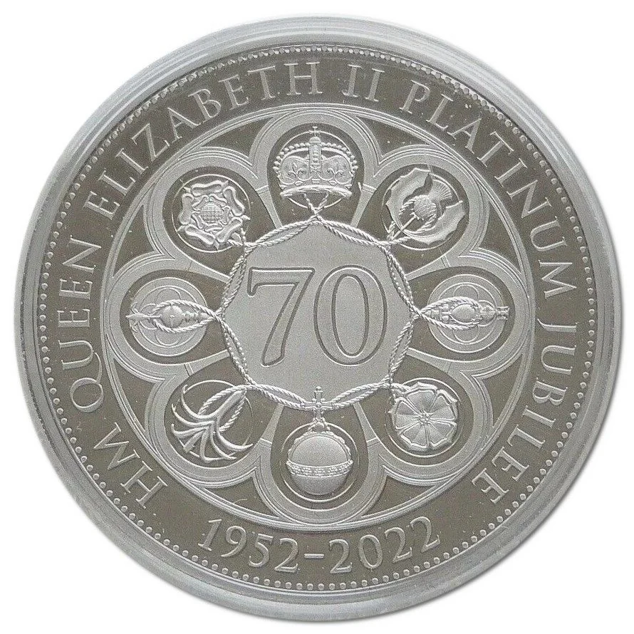 Design with 70 central, surrounded by Crown, Orb, and four national emblems. Outer circle contains lettering.