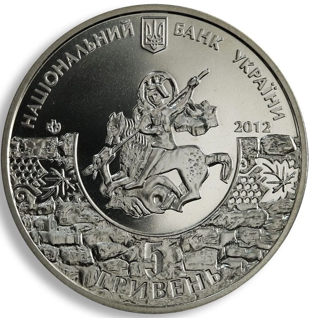 The obverse features Ukraine's Small Coat of Arms, the year 2012, and the National Bank inscription. A 15th-century relief of St. George, discovered in a Genoese fortress, is flanked by stylized grapevines on a wall. Below are the coin's legend and the Mint logo.