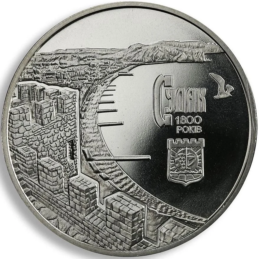 A conventionalized town view from the fortress wall shows the beaches (left). To the right, against the sea, are the inscription "СУДАК/1800/РОКІВ" and the town's coat of arms.