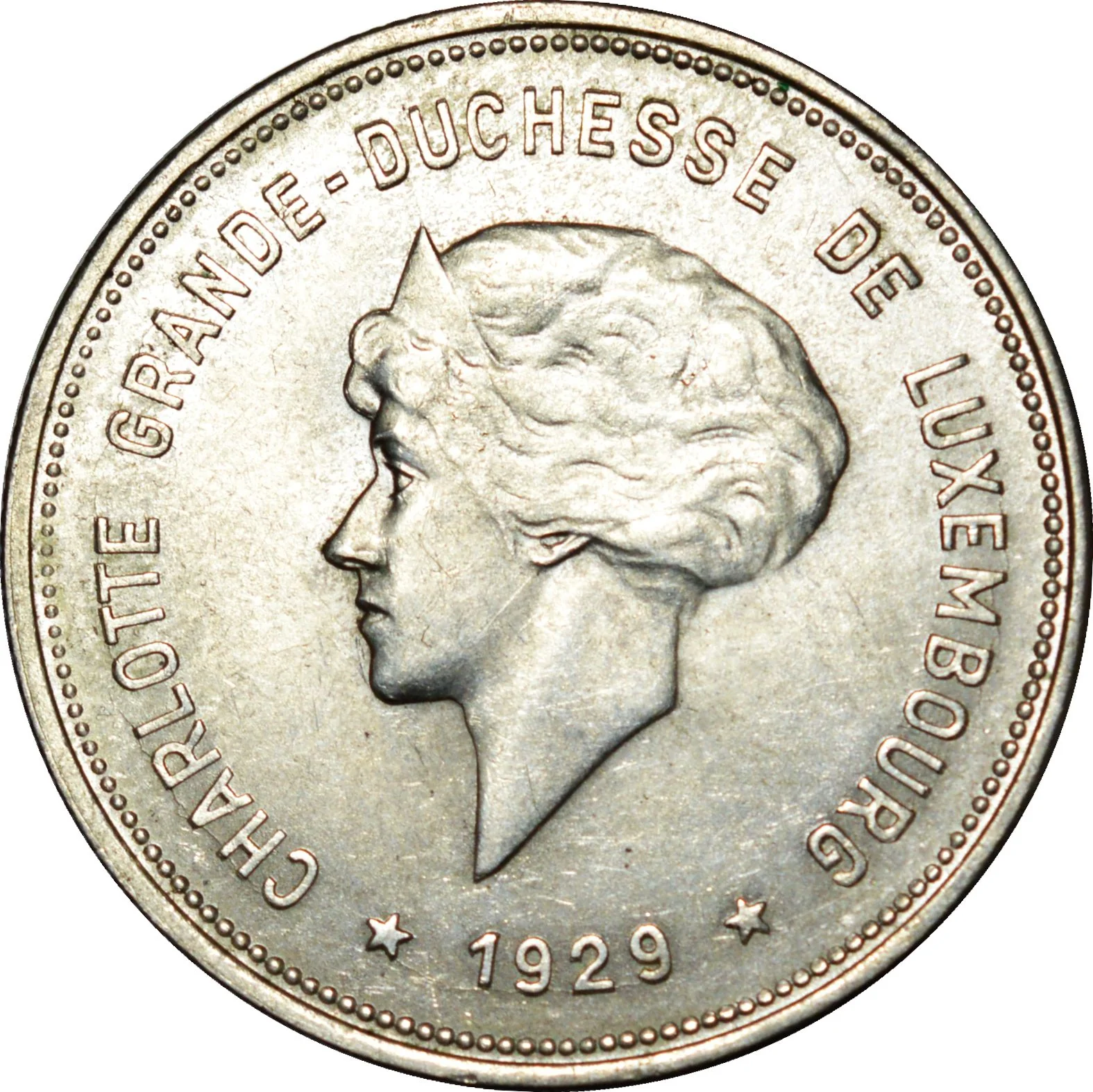 Description: Left-facing portrait of Grand Duchess Charlotte of Luxembourg (1896–1985), with legend and year between two stars below. Pearls surround.