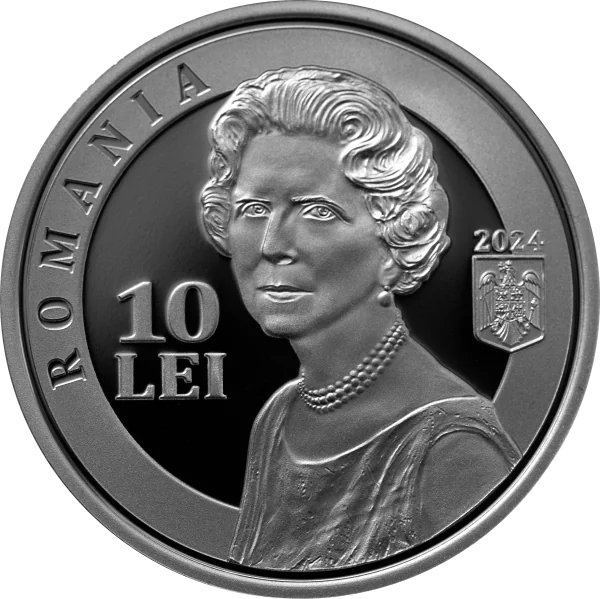 Queen Mother Helen's portrait, who advocated for Bucharest's first emergency hospital, with "ROMANIA" arched above, the face value "10 LEI", the year "2024", and Romania's coat of arms.