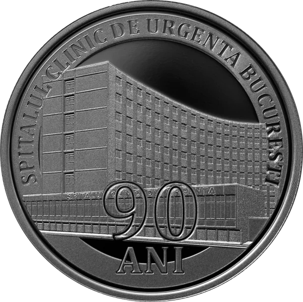 Reverse: hospital building with inscriptions “SPITALUL CLINIC DE URGENTA BUCURESTI” and “90 ANI”.