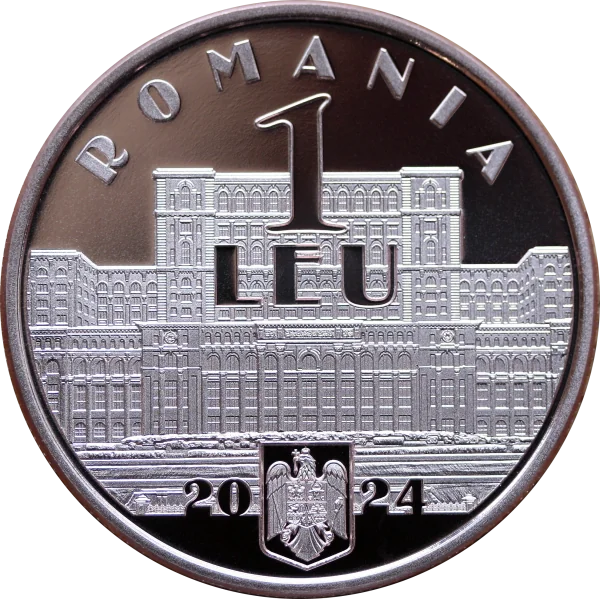 Romania's NATO accession treaty ratification site, the Palace of Parliament, with "ROMANIA," the coat of arms, "1 LEU," and "2024."