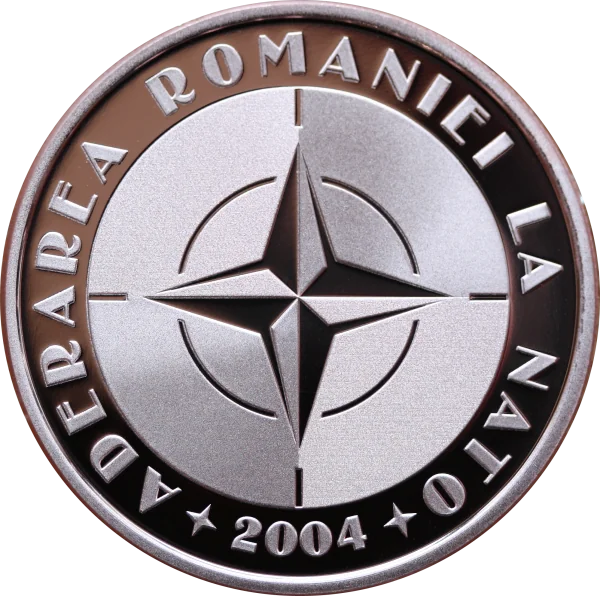 NATO logo with "ADERAREA ROMANIEI LA NATO" and the accession year "2004".