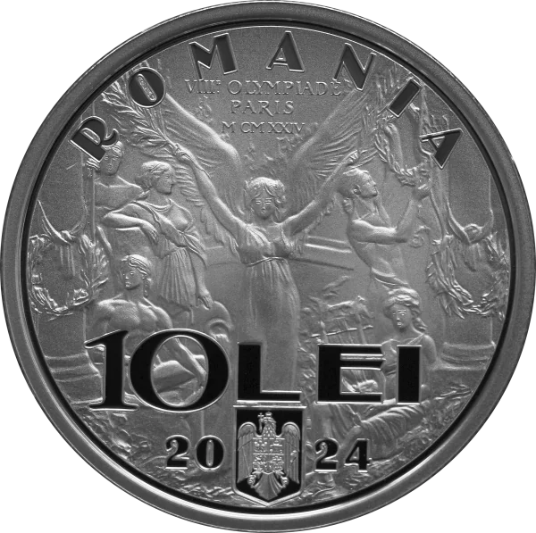 Romania's 1924 Olympic rugby team diploma, featuring "ROMANIA" in an arc, 10 LEI, the coat of arms, and the year 2024.