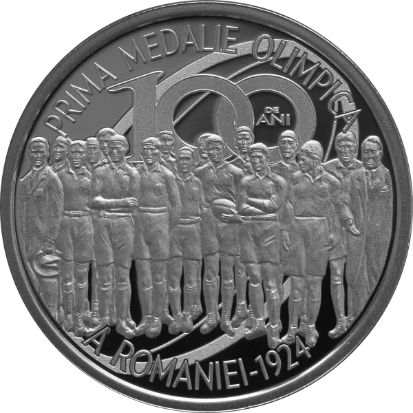 A rugby ball and Romania’s 1924 squad, with the inscriptions “PRIMA MEDALIE OLIMPICA A ROMANIEI - 1924” and “100 DE ANI”.