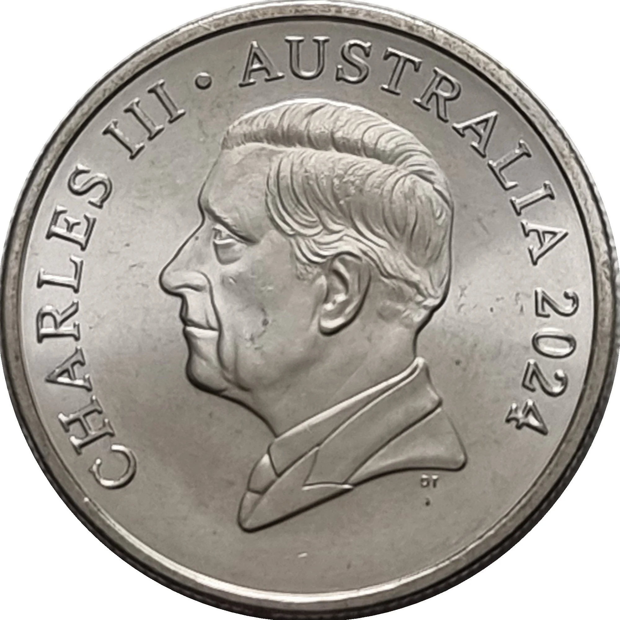 Uncrowned portrait of King Charles III facing left.