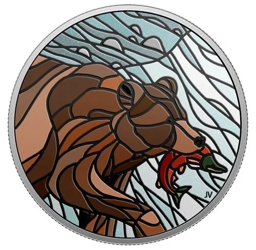 This reverse image uses Colour Mosaic technology, blending engraving and paint to create a mosaic-style portrait. Over 130 individually engraved "tiles" form a grizzly bear wading in a salmon-rich river. Engraved "grout" lines mimic raised tile, while varied paint effects add depth, contrasting with the polished, proof-shine rocks.
