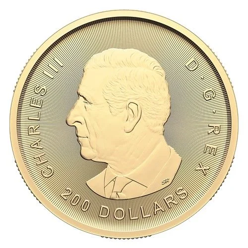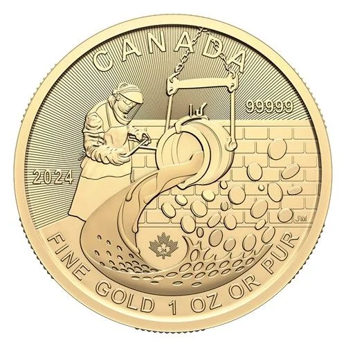 The reverse depicts the gold refining process: molten gold becoming a sheet, cut into blanks, and featuring a laser-engraved security mark—a textured maple leaf with a microscopic "24" for the year.